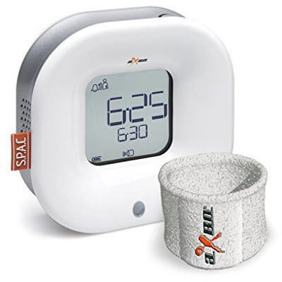 A skin-friendly wristband is worn that wirelessly connects to the clock. It monitors your movements and analyses your sleep cycles. It gives you a 30-minute window before your set time to wake up in which to rouse you. If during that window you are in your light sleep phase the wristband will vibrate causing you to wake up.