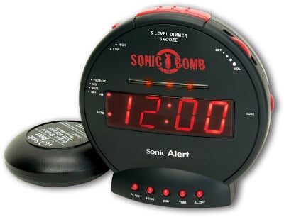 Those that sleep in an almost catatonic state would be served well by having their bed shaken in addition to the most annoying alarm sound possible. That means the Sonic Bomb alarm clock with bed shaker is in order. It is by far the best alarm clock for heavy sleepers.