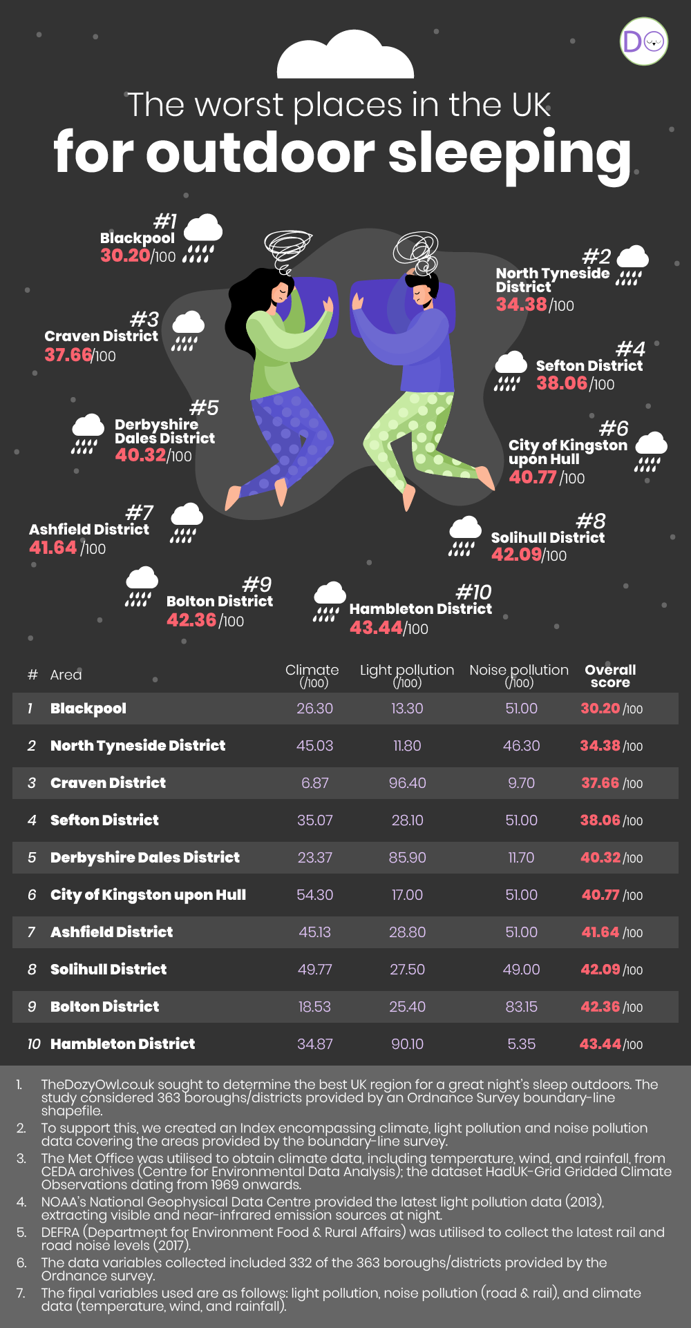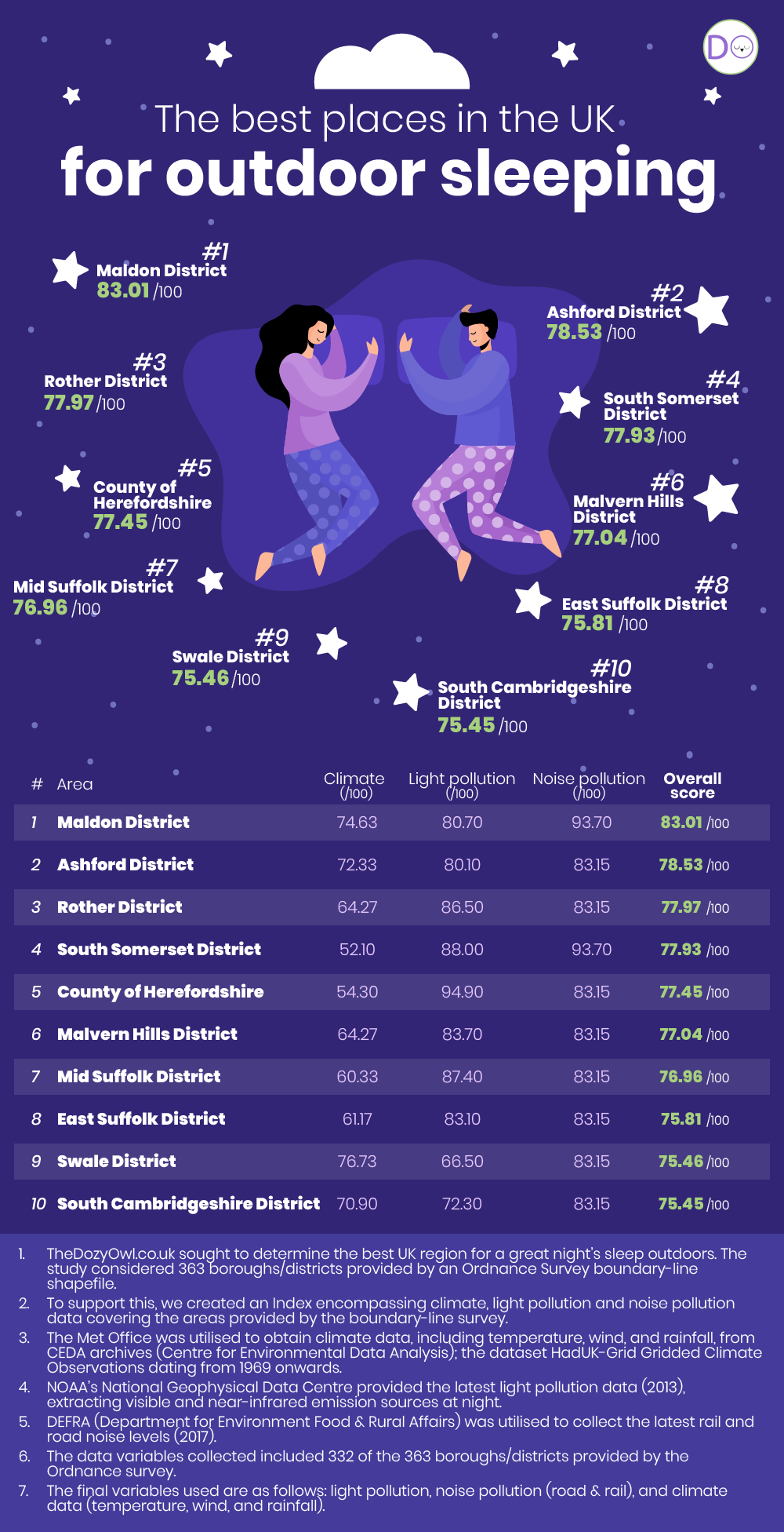 - TheDozyOwl.co.uk sought to determine the best UK area for a great night’s sleep outdoors. The study considered 363 boroughs/districts provided by an Ordnance Survey boundary-line shapefile.