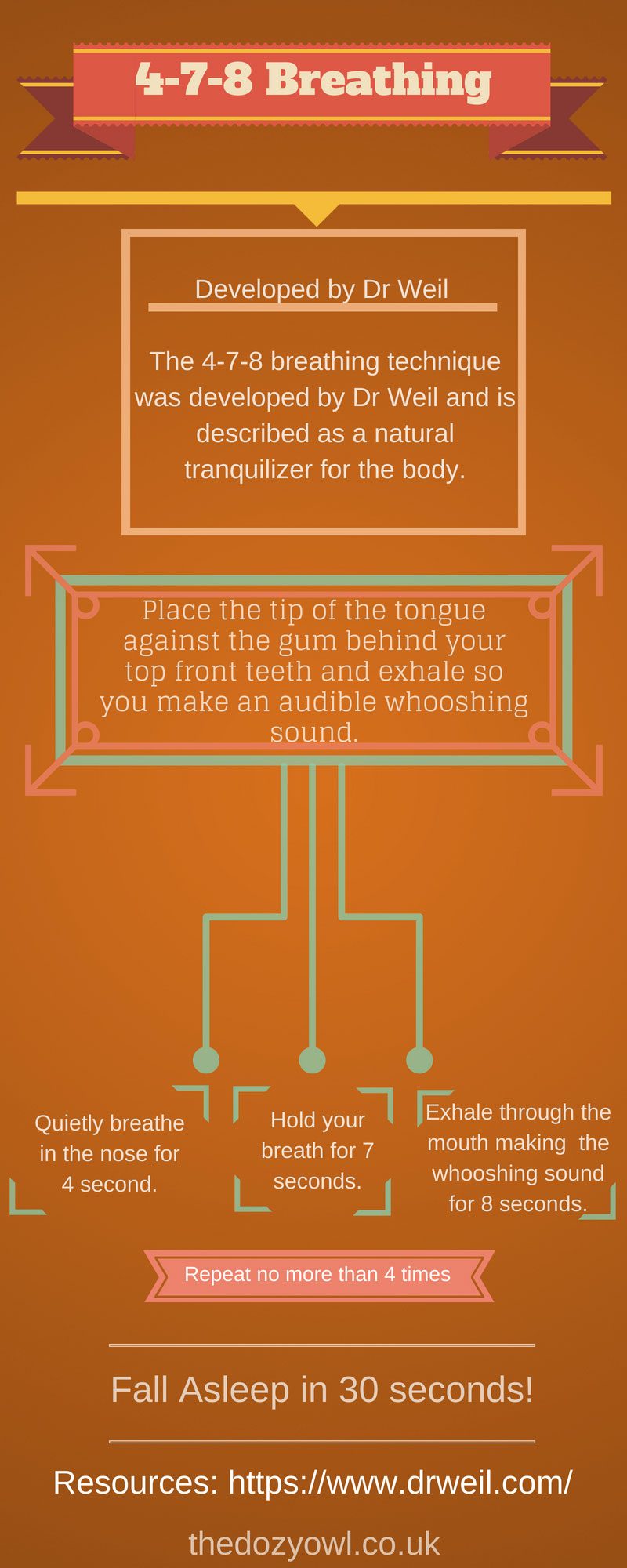 Another breathing exercise, the 4-7-8 breathing technique. It is a simple breathing technique you can perform right before bed to help you shut down your mind and fall into a silent slumber. I actually made up an infographic of it which you can check out below!