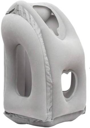 Like a massage table, with a face hole in it, the AirGoods travel pillow inflates into a massive frame-like pillow you can lean forward onto. It lets you fall asleep almost as if you are lying forward. It even has gaps in the side so you can hug it into place or hold your phone in front of yourself.