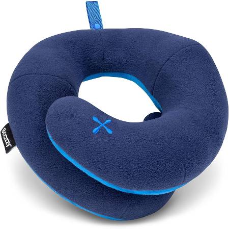 This travel pillow solves the ergonomic issue with traditional U-shaped pillows in that it supports your chin by overlapping at the front to support your neck all around. There will be no need to worry about your head drooping forward as you doze off.