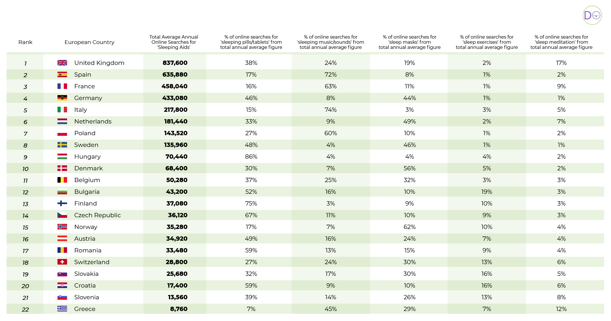 From sixth to eighth, there are over 100,000 online queries a year for sleeping aids in the Netherlands (181,440), Poland (143,520) and Sweden (135,960).